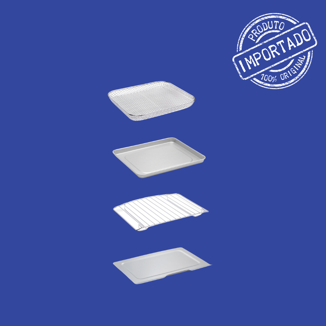 Inclui acessório metal mesh basket, bandeja para assar, grelha para broil e bandeja de migalhas removível para limpeza fácil.